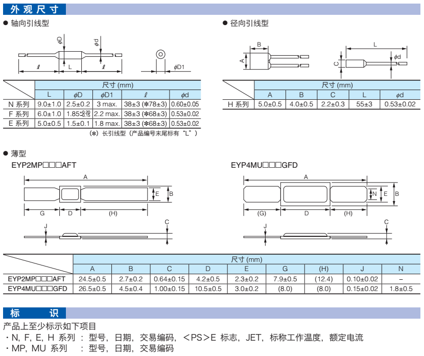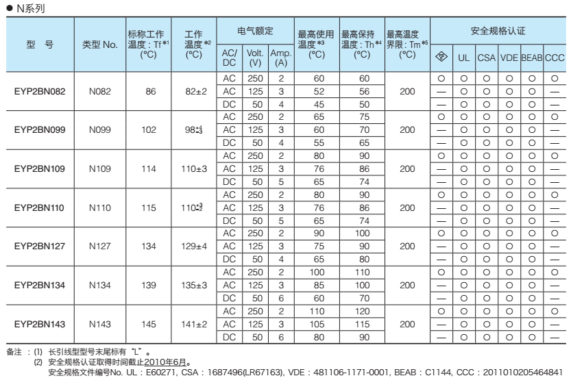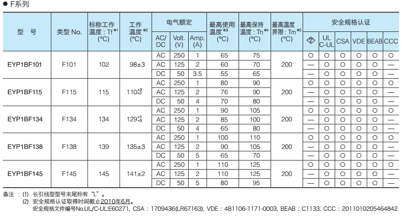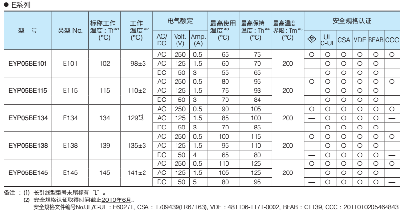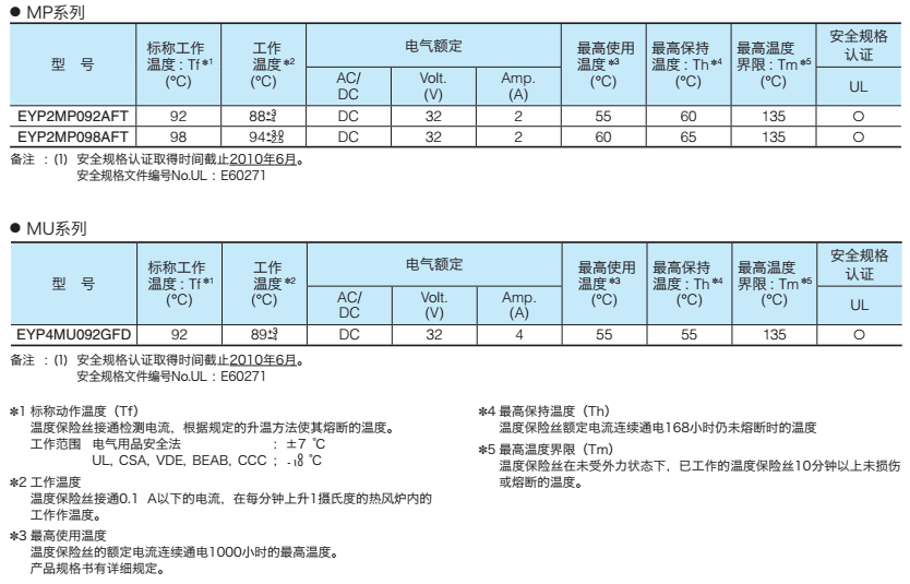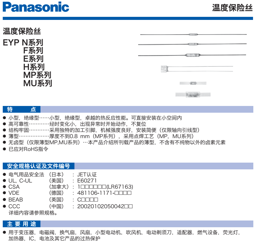 我司銷售日本松下/Panasonic生產(chǎn)的各系列溫度保險絲,有EYP2BN系列、EYP1BF系列、EYP05BE系列、EYP2BH系列、EYP2MP系列、EYP4MU系列等。有的型號庫存足,交期快捷,歡迎電話聯(lián)絡(luò)。具體型號規(guī)格如下: