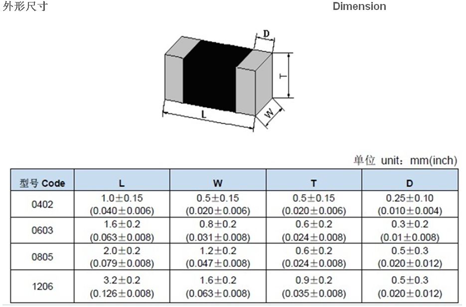 尺寸規(guī)格:0402(1005)、0603(1608)、0805(2012);