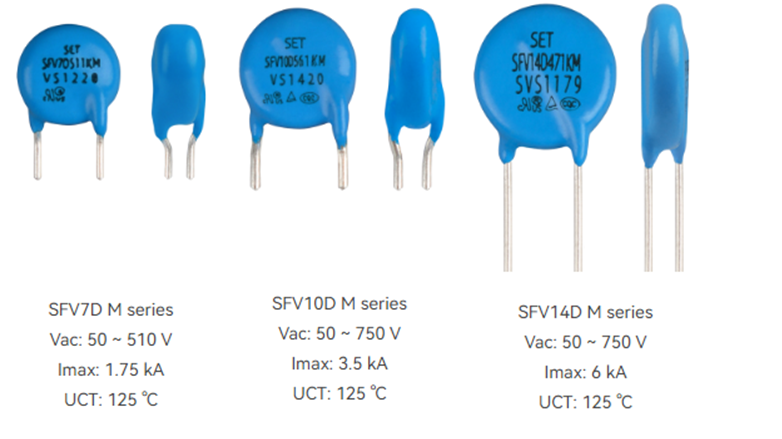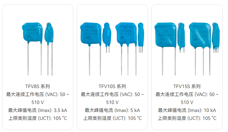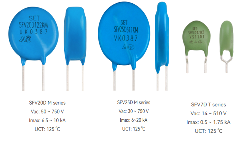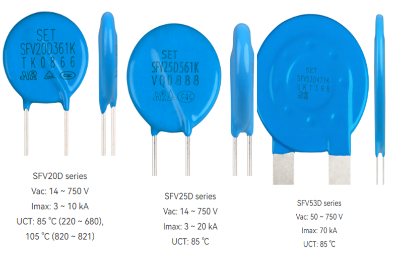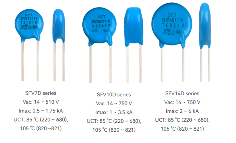 東莞市愛多電子(Eidoll)銷售的SET的金屬氧化膜壓敏電阻 (MOV)是以氧化鋅 (ZnO) 為主要成分的非線性電阻元件,該元件浪涌電流耐量及非線性系數(shù)非常大,在閾值電壓以下時,電阻非常高,幾乎沒有電流流過,如果超過該閾值電壓,電阻急劇降低,可以泄放大電流。由于具備這種特性,MOV作為電子、電氣設備的保護元件,對異常電壓的吸收,雷擊浪涌的吸收等發(fā)揮著很大的作用。賽爾特(SETsafe | SETfuse)公司的壓敏電阻 (MOV)具有高通流密度、低限制電壓、良好的交流耐受能力,可以根據(jù)客戶要求定制。具體的產(chǎn)品規(guī)格如下: