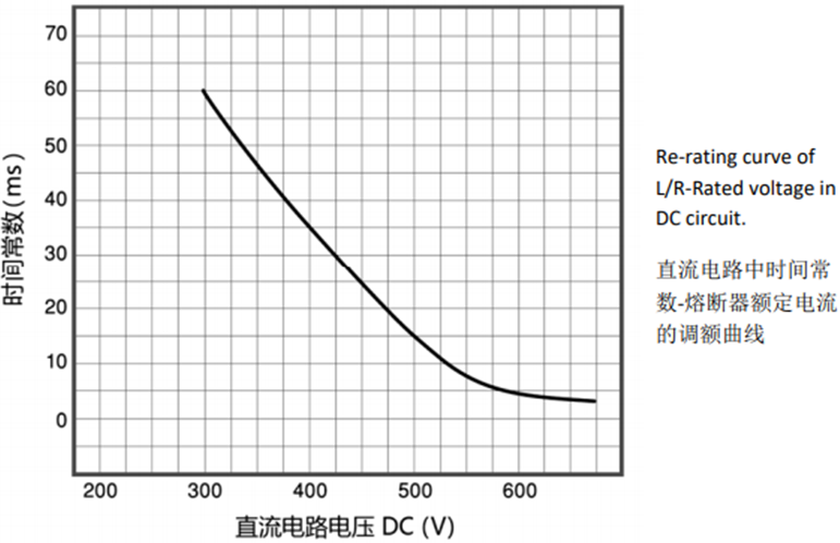 熔斷器工作時容易受到周圍環(huán)境及持續(xù)通過的電流的影響, 為了延長熔斷器的使用壽命, 必須確保熔斷器的負載電流小于額定電流65%.  當應用于直流回路保護時, 根據(jù)直流回路的實際條件, 有時必須確保熔斷器的額定電壓高于回路電 壓(參考下面直流電路的調額曲線 ).