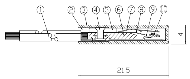 7.可動(dòng)臂通過(guò)10.可動(dòng)觸點(diǎn)和固定觸點(diǎn)將電流從1.引線輸送到9.下端子,該下端子插入模制在6.下塊中。7.活動(dòng)臂、8.雙金屬盤和5.上板用鉚釘固定,用4.孔眼固定6.下塊。將該組件插入3.外殼中,并灌注環(huán)氧樹脂進(jìn)行密封。