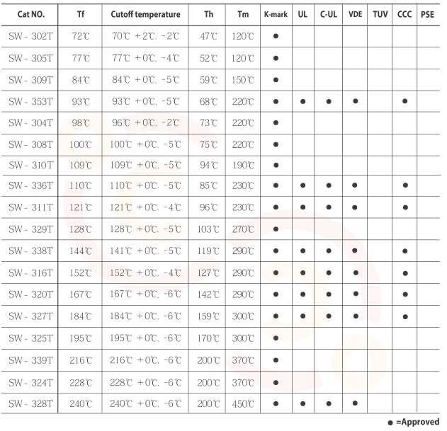 型號(hào)有:SW-302T 72℃, SW-305T 77℃,SW-309T 84℃,SW-353T 93℃,SW-304T 98℃,SW-308T 100℃,SW-310T 109℃,SW-336T 110℃,SW-311T 121℃,SW-329T 128℃,SW-338T 144℃,SW-316T 152℃,SW-320T 167℃,SW-327T 184℃,SW-325T 195℃,SW-339T 216℃,SW-324T 228℃,SW-328T 240℃.