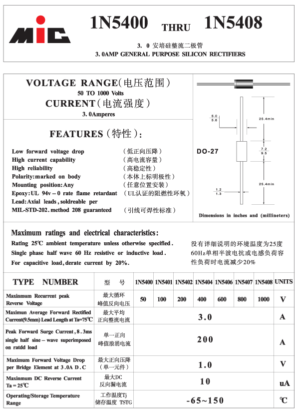東莞市愛多電子代理銷售MIC各型號品牌二極管,具體型號有,1N5400,1N5401.1N5402,1N5404,1N5406,1N5407,1N5408,具體規(guī)格如下: