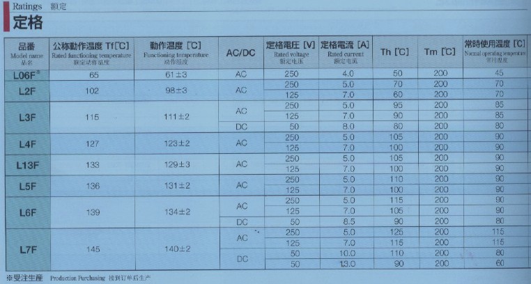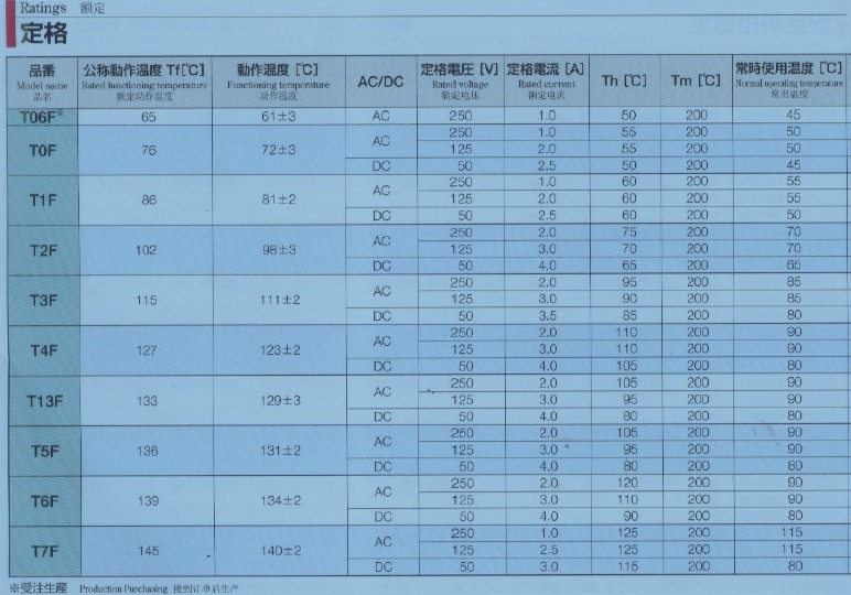 2)T-F系列,AC250V 1A/AC125V 2.0-3.0A,具體型號如下: