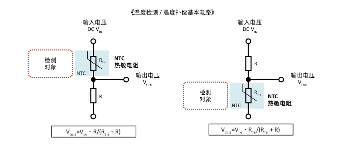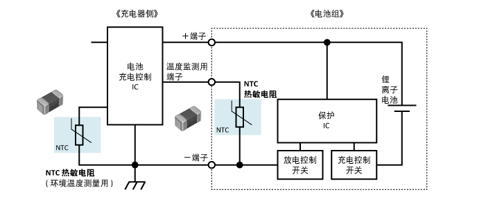 其基本電路是與NTC熱敏電阻以及固定電阻進(jìn)行串聯(lián)的分壓電路。CPU及功率模塊等安裝在發(fā)熱部位附近的NTC熱敏電阻的電阻值會(huì)隨溫度上升而下降,因此分壓電路的輸出電壓會(huì)發(fā)生變化。該變化輸送至微控制器后將會(huì)保護(hù)電路元件免受過熱造成的影響,或進(jìn)行溫度補(bǔ)償。 圖2 溫度檢測/溫度補(bǔ)償基本電路 ![]() 應(yīng)用示例:移動(dòng)設(shè)備電池充電中的溫度檢測