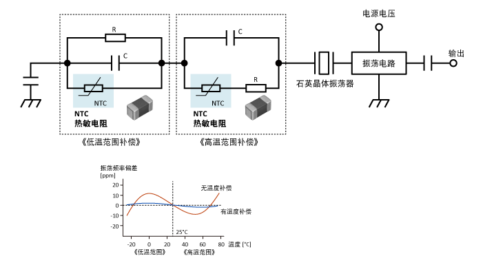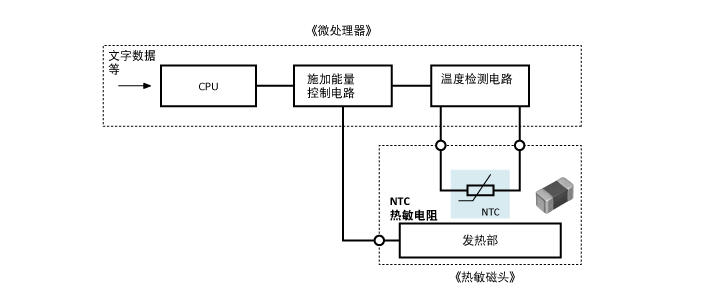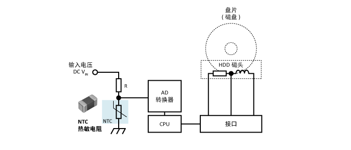 LED照明系統(tǒng)擁有耗電量低、壽命長等特點(diǎn),但根據(jù)不同的使用方法,其會(huì)出現(xiàn)壽命縮短、發(fā)光效率降低等情況。 圖5 LED照明系統(tǒng)的溫度檢測 ![]() 應(yīng)用示例:HDD的溫度檢測用于電腦存儲(chǔ)裝置等的HDD是對(duì)于溫度極為敏感的裝置,當(dāng)溫度過高時(shí)出現(xiàn)錯(cuò)誤或故障的可能性也會(huì)提高。為此,其會(huì)通過溫度傳感器對(duì)溫度進(jìn)行檢測,當(dāng)超過規(guī)定溫度時(shí),將會(huì)通過風(fēng)扇進(jìn)行送風(fēng)冷卻。雖然使用NTC熱敏電阻與固定電阻的溫度檢測電路精度不及溫度傳感器IC,但優(yōu)勢在于成本極低。下圖為替換溫度傳感器IC后的示例。 圖6 HDD的溫度檢測 ![]() 應(yīng)用示例:HDD磁頭寫入時(shí)的溫度檢測將數(shù)據(jù)寫入HDD時(shí),是通過記錄磁頭產(chǎn)生的磁力,將其以磁性方式記錄在盤片(磁盤)磁性膜上。寫入過度時(shí)磁頭會(huì)發(fā)熱,從而會(huì)對(duì)磁頭器件造成不良影響。為此,需要使用下圖所示NTC熱敏電阻,通過溫度檢測電路控制流過磁頭的電流。 圖7 HDD磁頭寫入時(shí)的溫度檢測 ![]() 應(yīng)用示例:熱敏打印機(jī)的溫度檢測POS收銀臺(tái)的收據(jù)打印機(jī)、條形碼/標(biāo)簽打印機(jī)等使用有用于打印熱敏紙的熱敏打印機(jī)。熱敏打印機(jī)磁頭溫度與打印濃度呈相關(guān)關(guān)系,溫度越高,濃度則越高,溫度越低,濃度則越低。其根據(jù)檢測的熱敏磁頭溫度,通過改變輸送至熱敏磁頭脈沖電流,并控制電壓,從而使其保持一定的打印濃度。使用NTC熱敏電阻的溫度檢測電路方框圖示例如下圖所示。 圖8 熱敏打印機(jī)的溫度檢測 ![]() 應(yīng)用示例:LCD(液晶顯示器)的溫度補(bǔ)償用于智能手機(jī)、平板等設(shè)備中的LCD(液晶顯示器)液晶物質(zhì)存在溫度依賴性,其對(duì)比度會(huì)因環(huán)境溫度而產(chǎn)生變化。因此需要根據(jù)環(huán)境溫度調(diào)整驅(qū)動(dòng)電壓。下圖為組合了NTC熱敏電阻與固定電阻的代表性溫度補(bǔ)償電路示例。 圖9 LCD(液晶顯示器)的溫度補(bǔ)償 ![]() 應(yīng)用示例:晶體振蕩器的溫度補(bǔ)償在電腦等電子設(shè)備中,若要產(chǎn)生基準(zhǔn)頻率(時(shí)鐘基準(zhǔn)信號(hào)),則需要使用利用晶振的晶體振蕩器。晶振溫度特性如下圖圖片曲線(紅線:無溫度補(bǔ)償)所示,呈現(xiàn)以基準(zhǔn)溫度(通常為25℃)為拐點(diǎn)的3次曲線,振動(dòng)頻率偏差(縱軸)隨溫度發(fā)生大幅變化。而通過在低溫范圍與高溫范圍分別插入與晶振溫度特性相反的補(bǔ)償電路便可縮小振動(dòng)頻率偏差(藍(lán)線:有溫度補(bǔ)償)。該補(bǔ)償電路為模擬方式,低溫范圍與高溫范圍的補(bǔ)償電路分別由NTC熱敏電阻與電容器、電阻構(gòu)成。內(nèi)置溫度補(bǔ)償電路的晶體振蕩器稱為TCXO(溫度補(bǔ)償型晶體振蕩器、Temperature Compensated Xtal Oscillator)。 圖10 晶體振蕩器的溫度補(bǔ)償 ![]() 用示例:半導(dǎo)體壓力傳感器的溫度補(bǔ)償