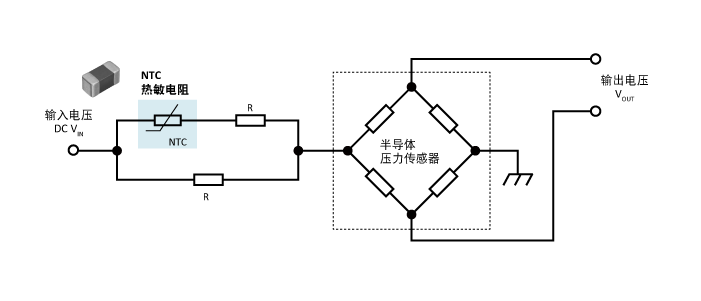 家電設(shè)備、FA設(shè)備、車載設(shè)備等多使用通過MEMS(微機(jī)電系統(tǒng))技術(shù)制造的壓電電阻型半導(dǎo)體壓力傳感器。該傳感器是對(duì)硅基板進(jìn)行蝕刻加工,制作中空薄型壓敏膜片,在通過壓力產(chǎn)生應(yīng)力的部分形成4個(gè)作為傳感器器件的壓電電阻部分(應(yīng)變儀),并將其連接成為電橋狀。當(dāng)膜片因氣壓或水壓等受到應(yīng)力作用時(shí),傳感器器件上將會(huì)出現(xiàn)電阻差,此時(shí)從電橋電路兩端將其作為電氣信號(hào)取出。 圖11 半導(dǎo)體壓力傳感器的溫度補(bǔ)償 ![]() 應(yīng)用示例:半導(dǎo)體熱保護(hù)