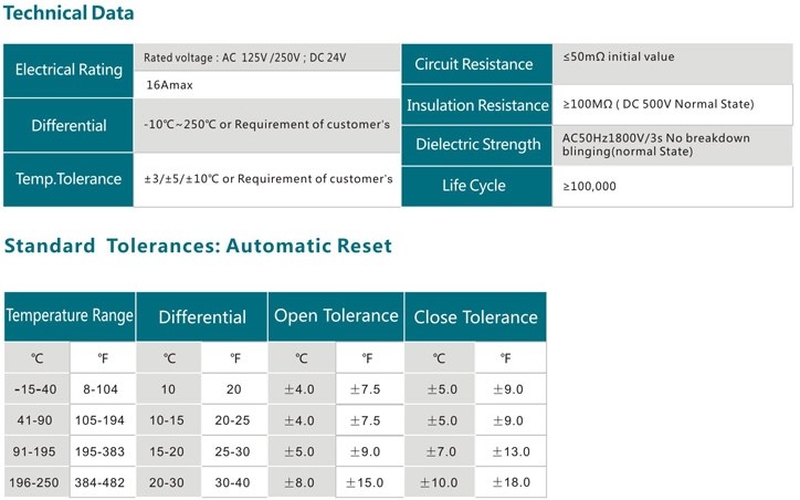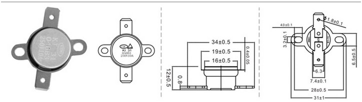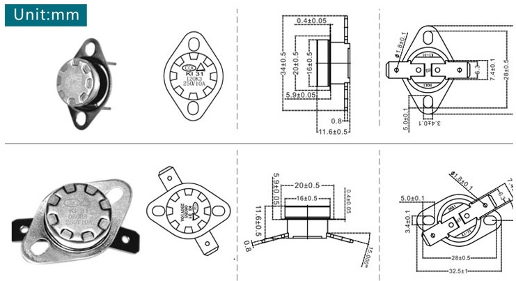 KI31&KSD301 series snap-action thermostat is a small size bimetal thermostat with a metal cap which belongs to thermal relays' family. The principle is one function of bimetal discs is snap action under the change of the temperature. The snap action of the disc can push the action of the contact through the structure inside, then cause on or off on the circuit. The main characteristic are the fixation on working temperature, reliability of the snap-action, less flashover and long life span.