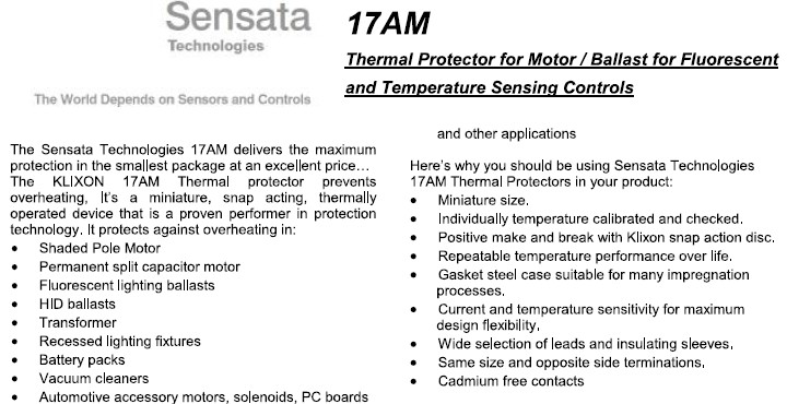 Product Name:Sensata/KLIXON 17AM Series Thermal Protector