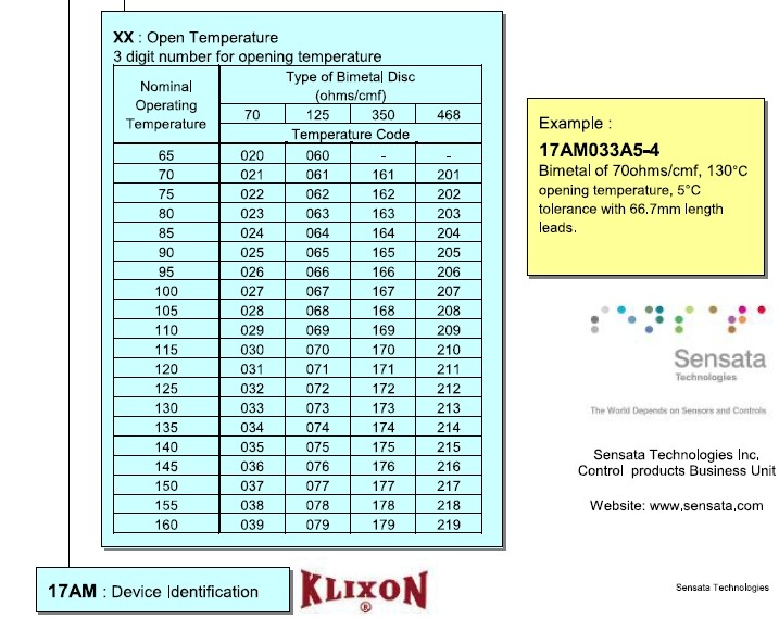 Low resistor models:17AM020A5 65℃,17AM021A5 70℃,17AM022A5 75 ℃,17AM023A5,80℃,17AM024A5, 85℃,17AM025A5 90℃,17AM026A5 95℃,17AM027A5 100℃,17AM028A5 105℃,17AM029A5 110℃,17AM030A5 115℃,17AM031A5 120℃,17AM032A5 125℃,17AM033A5 130℃,17AM034A5 135℃,17AM035A5 140℃,17AM036A5 145℃,17AM037A5 150℃,17AM038A5 155℃,17AM039A5 160℃ etc